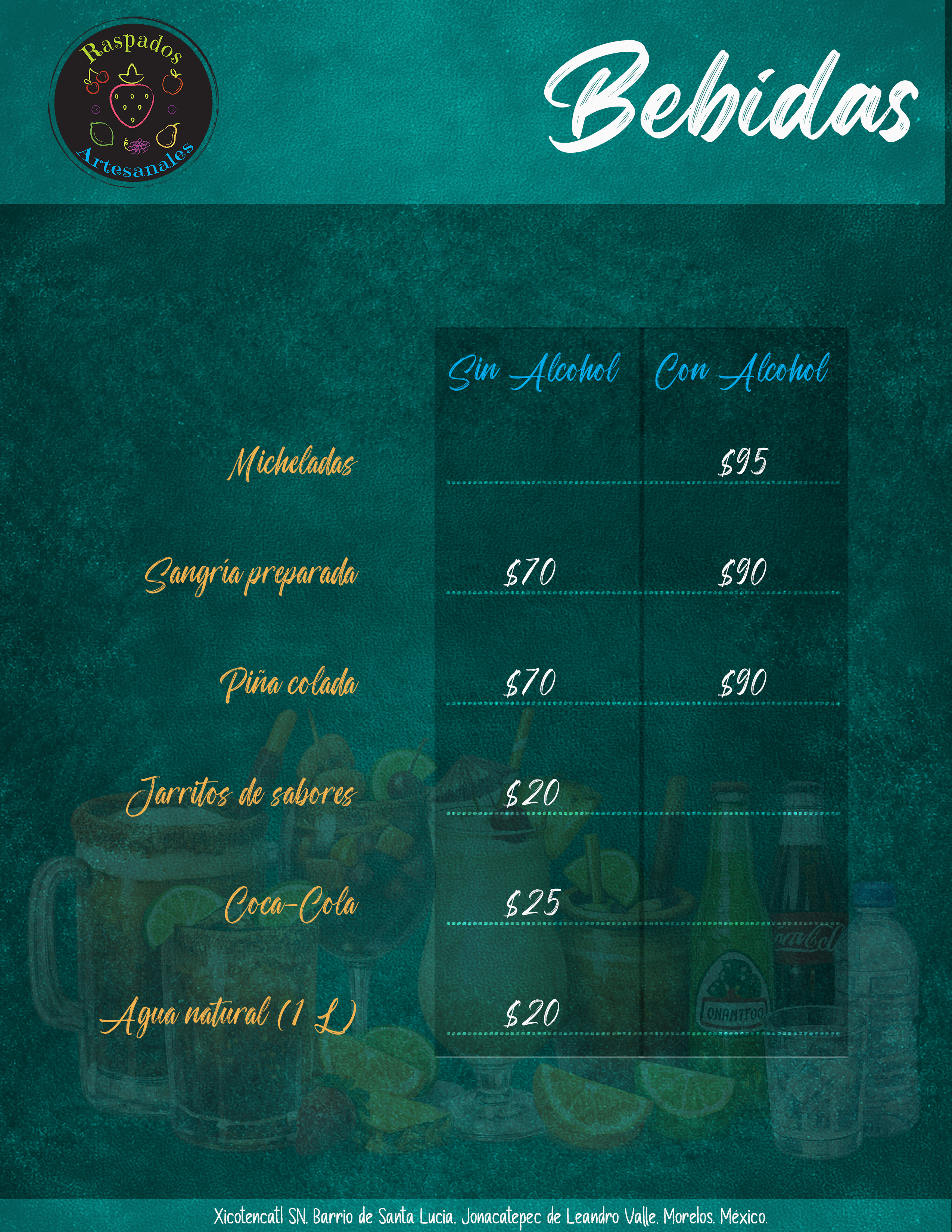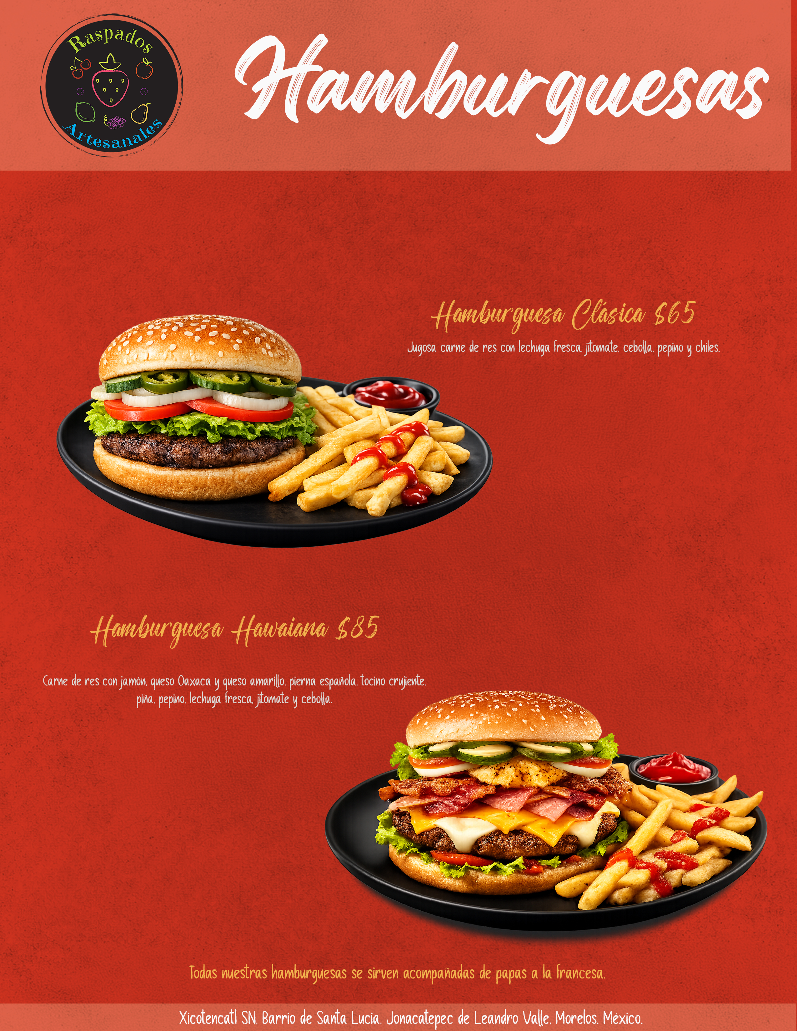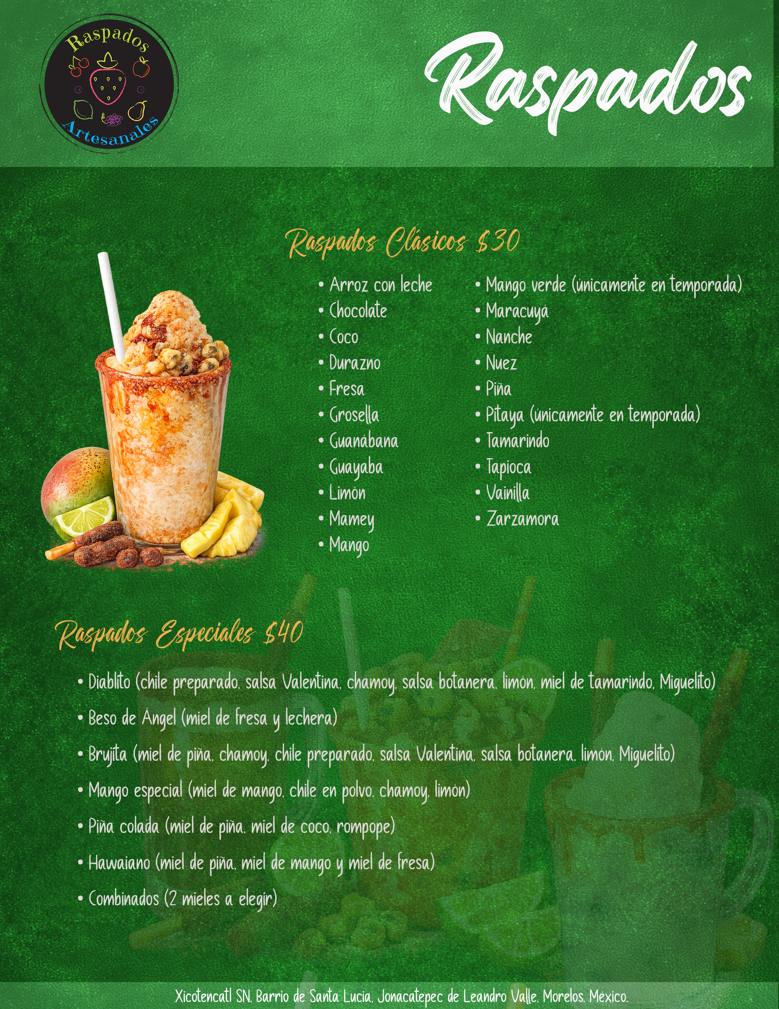 En Raspados Artesanales elaboramos raspados con fruta natural, sin saborizantes ni conservadores. También ofrecemos hamburguesas, botanas y bebidas para acompañar.